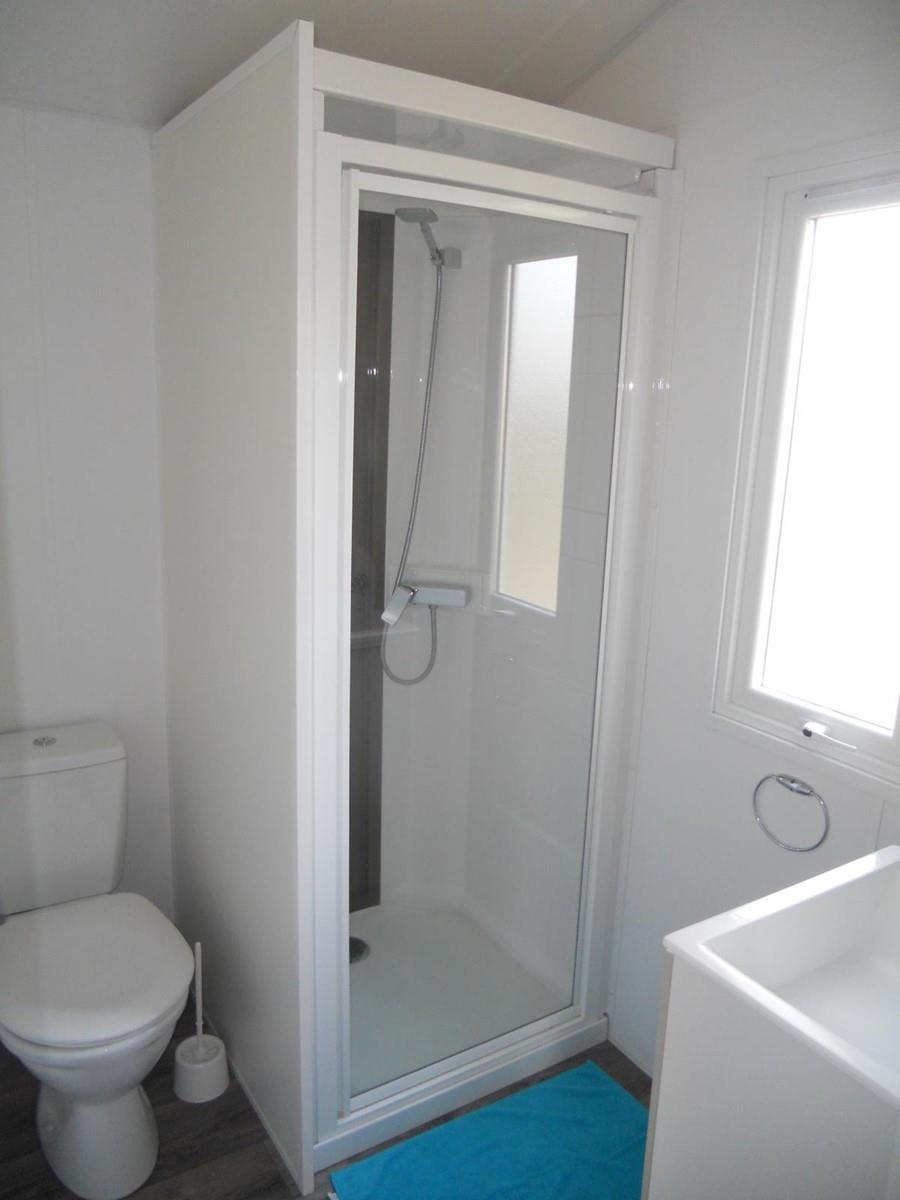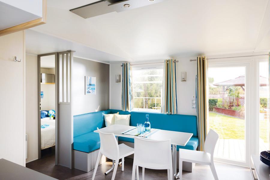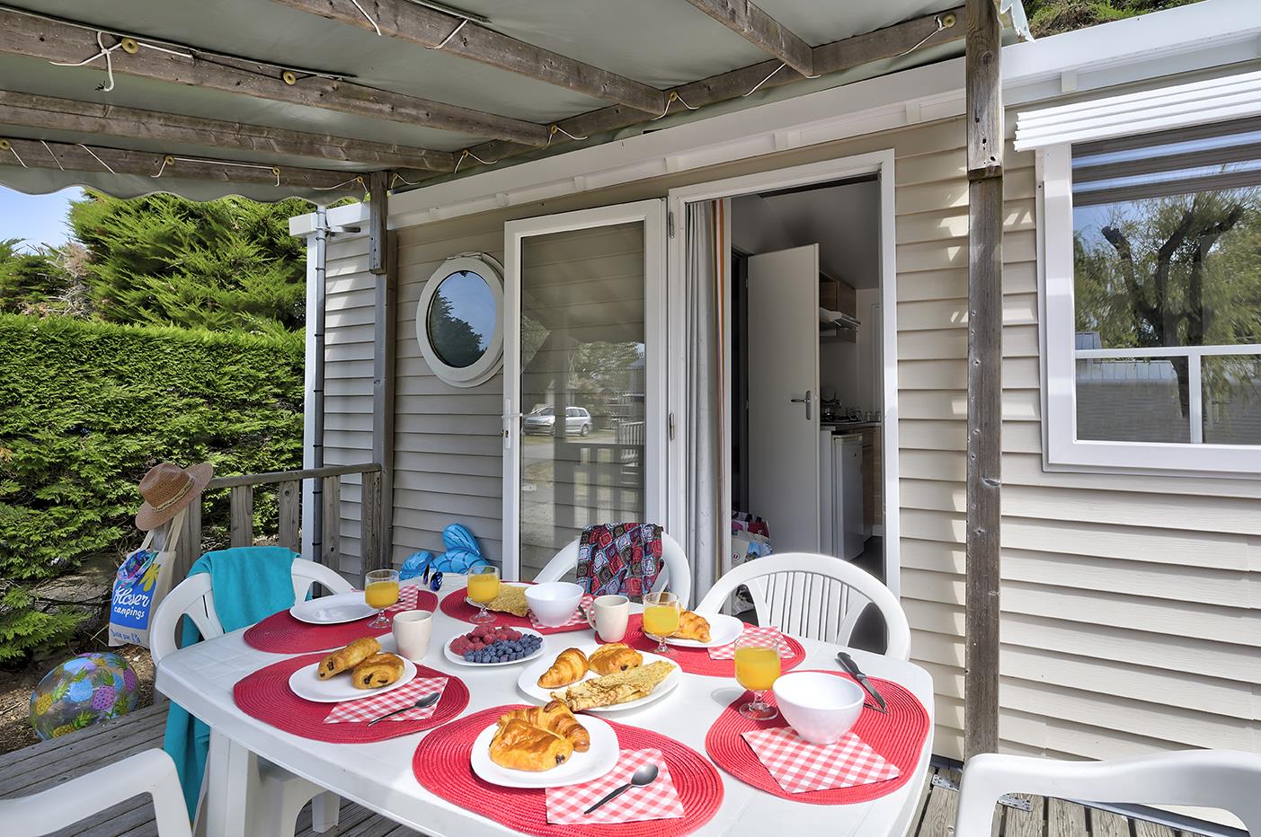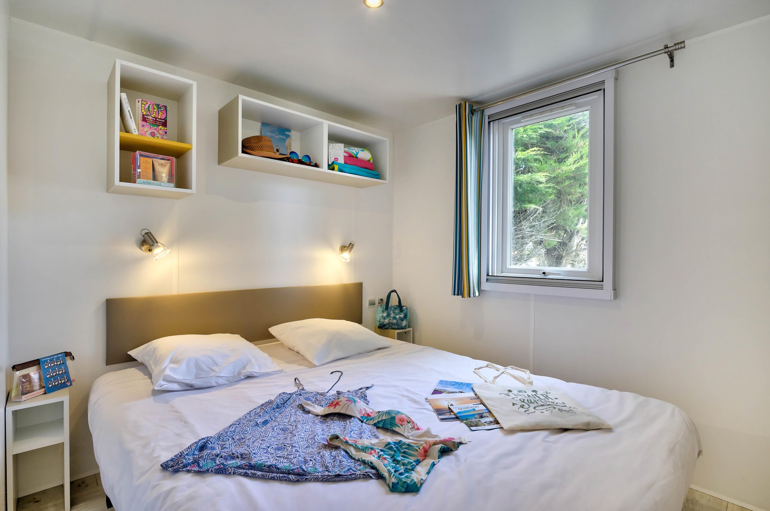 Séjournez dans l’un de nos mobil-homes avec ou sans télévision à Quiberon disponibles en 1, 2 ou en 3 chambres. Offrez-vous des vacances en camping à Quiberon abordables dans nos locations standard et confort grâce à nos offres spéciales dès 199€ la semaine. Pour un confort optimal, optez pour nos mobil-homes « Homeflower » avec une large palette d’équipements inclus : télévision, climatisation, lave-vaisselle, plancha et surtout draps et serviettes inclus. Équipés de terrasse semi-couverte, nos mobil-homes en location vous permettront de passer un séjour tant en intérieur qu’en extérieur. Profitez de moments de convivialité en famille ou entre amis sur la terrasse en profitant de repas entre amis ou en famille en camping 4 étoiles avec piscine à Quiberon. À l’intérieur, vous évoluerez dans un bel espace de vie avec banquette et table et coin cuisine tout équipé. Comme à la maison, profitez de chambres confortables et d’une salle d’eau avec douche et évier avec rangement.