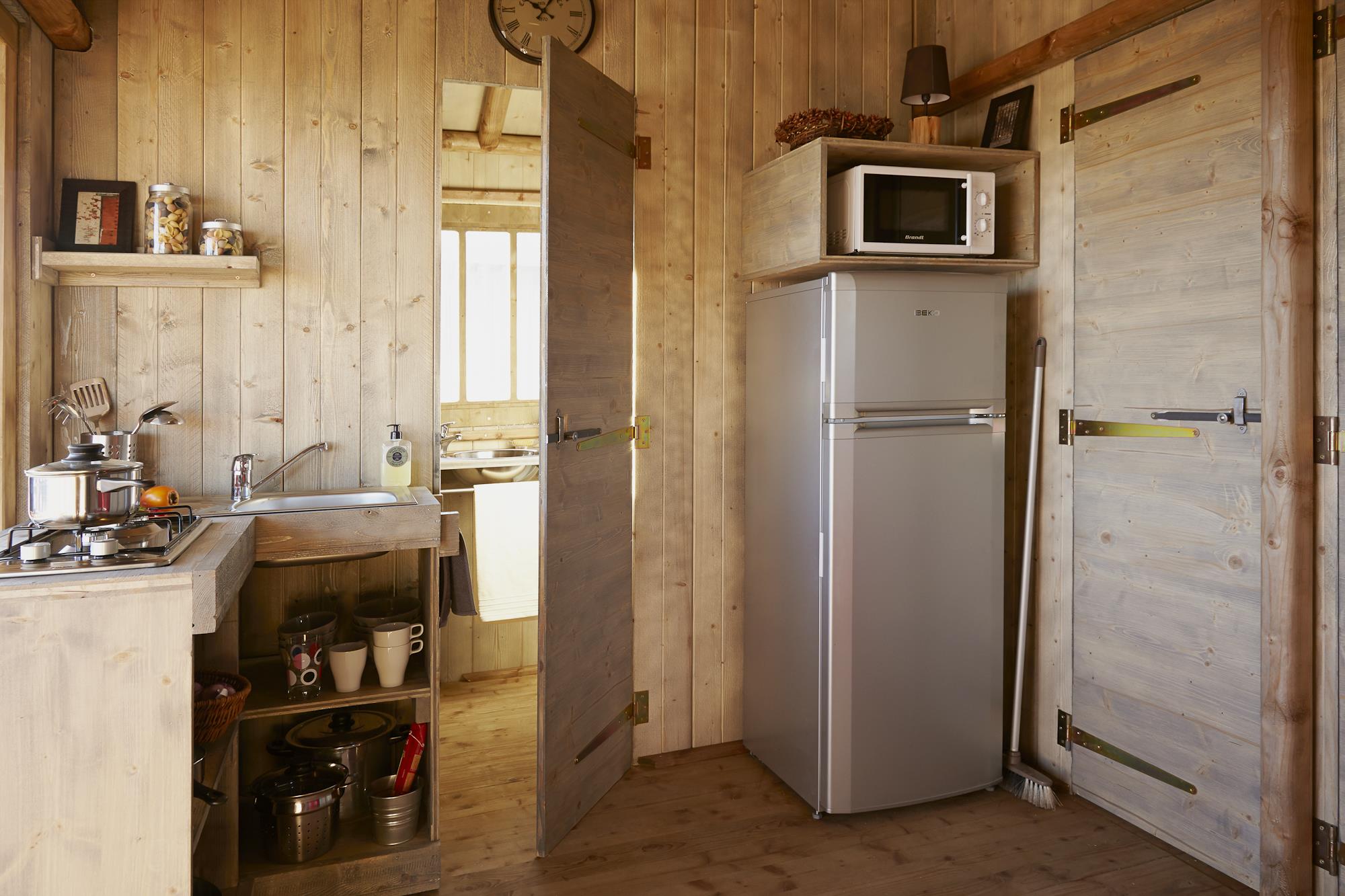 Son confort, son grand séjour ouvert, sa terrasse couverte ainsi que ses 2 chambres (2 lits simples 80×190 cm, 1 lit double 140×200 cm) vous feront tomber sous le charme de notre cabane toute équipée, dans une ambiance chalet très cosy.