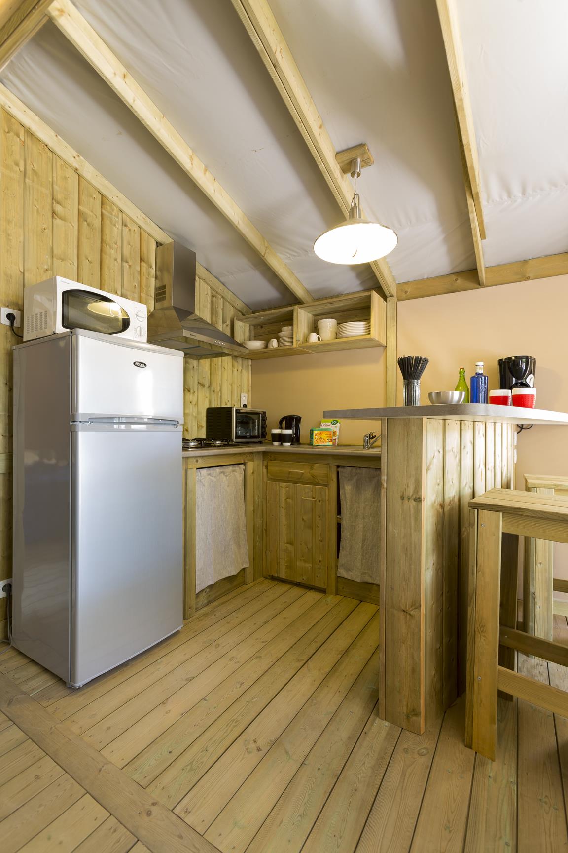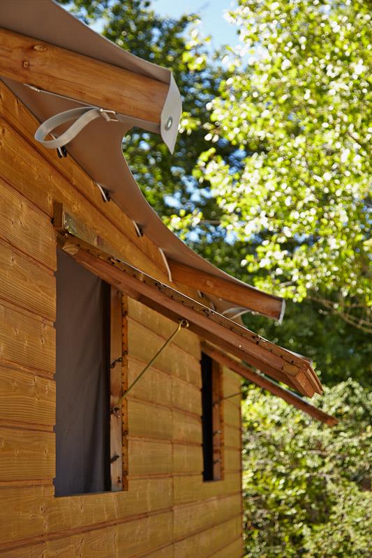 Notre cabane équipée de 34m2 (avec sanitaire) saura vous séduire de par son confort, ses 2 chambres (1 lit double 140x200cm, 2 lits simples 80x190cm) son décor atypique toilé et boisé ainsi que sa grande terrasse couverte.