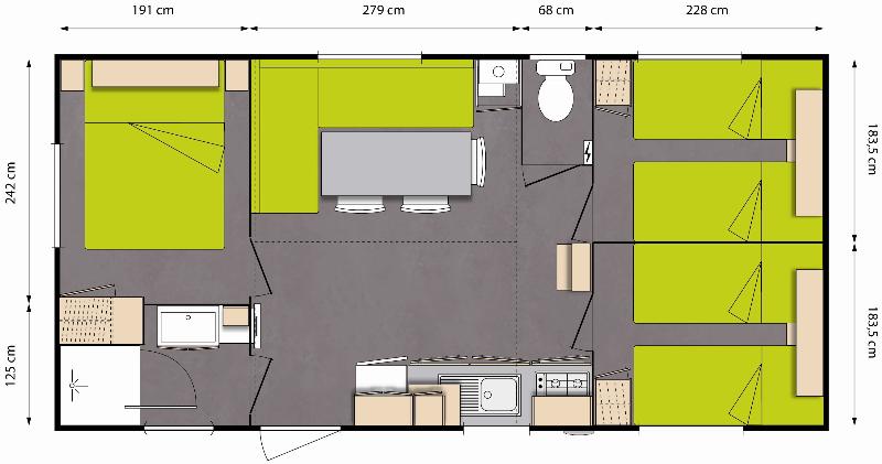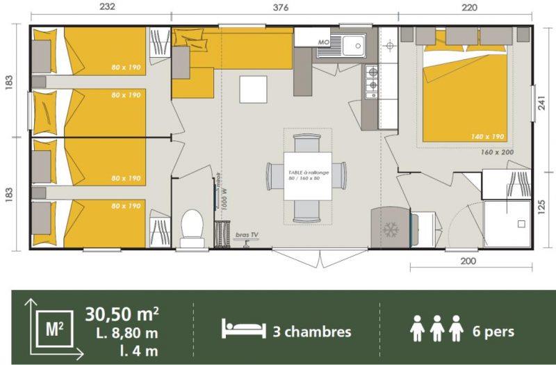 Meilleur rapport qualité/prix, découvrez notre joli mobil-home tout équipé de 31m2 pouvant accueillir jusqu’à 6 personnes.