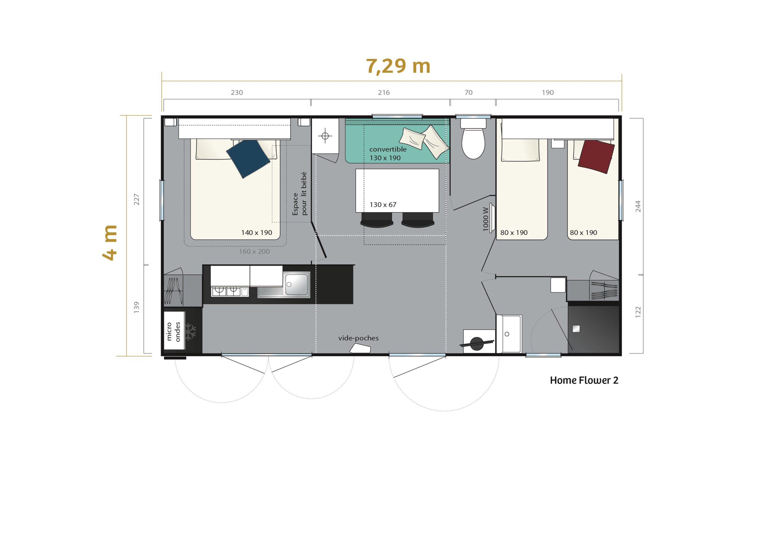 Notre spacieuse Sweet Flower toute équipée de 43 m2 pour 4 personnes sur pilotis avec son grand séjour de 20m2 avec TV, composé d’un grand retour bar et d’un mini four, son espace nuit avec 2 chambres avec draps inclus (1 lit double 160x190cm, 2 lits simples 80x190cm) est la réponse à votre envie !
